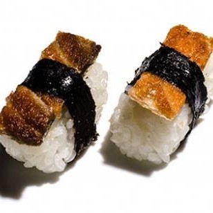 2 unidades de bolinho de arroz com uma fatia de salmão crú por cima.