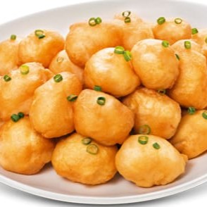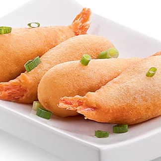 6 unidades de camarões descascados, empanados e fritos, salpicado com cebolinha. Acompanha 1 molho rosé.