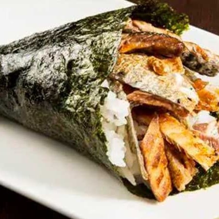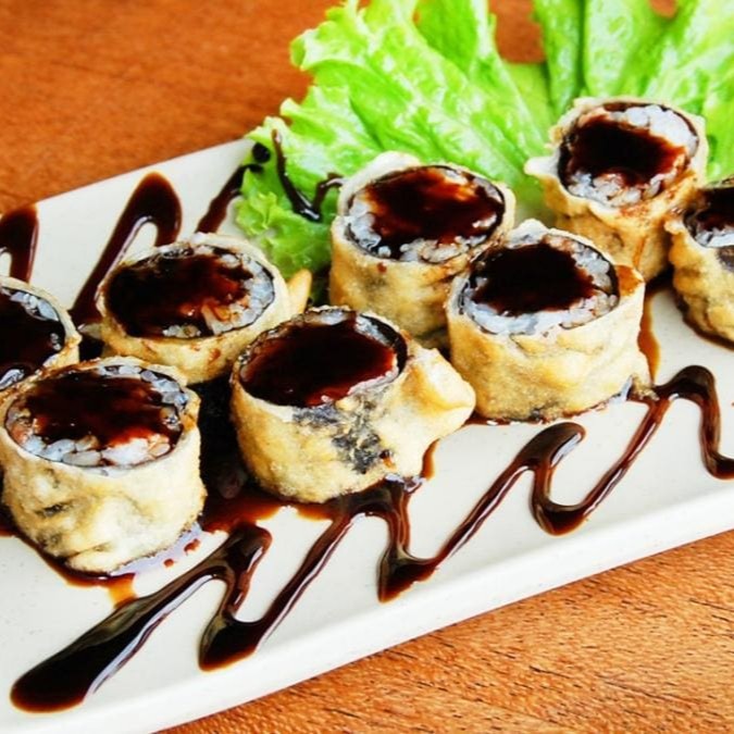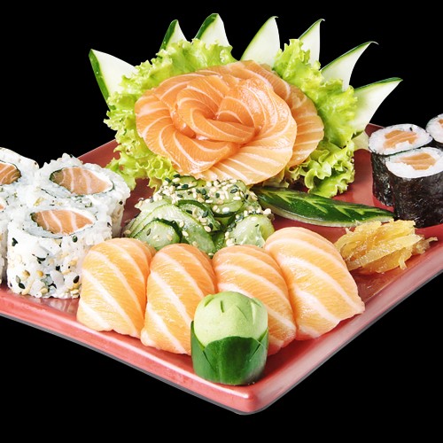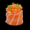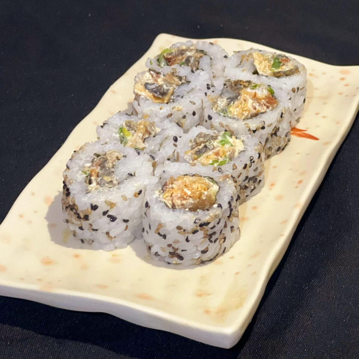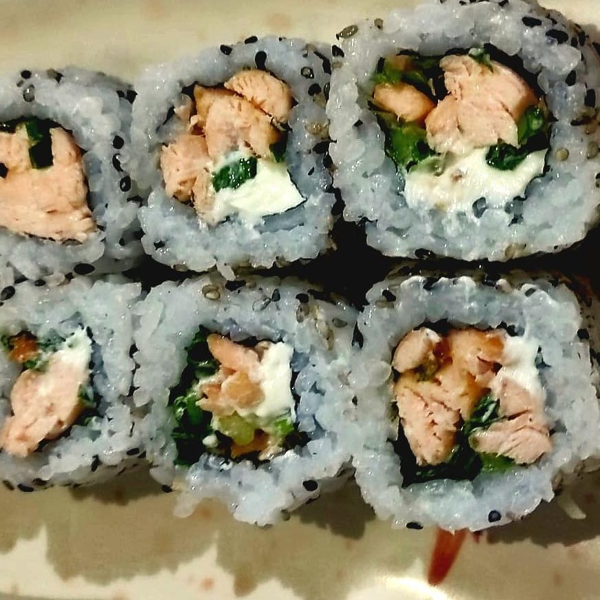 8 unidades de sushi, nori, gohan, salmão com cebolinha, kani e cream cheese, com molho tarê por cima.