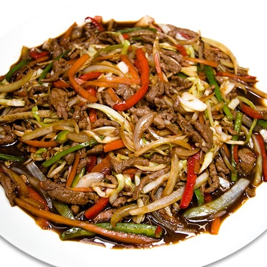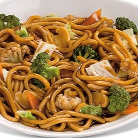 Macarrão chinês, carne bovina e legumes, temperado ao molho shoyu.