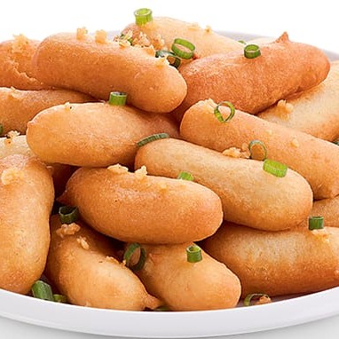 Filé de peixe sem espinho, empanado e frito, salpicado com alho e cebolinha.