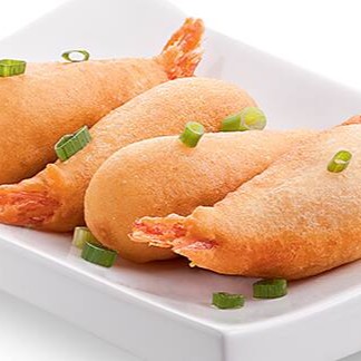 12 unidades de camarões descascados, empanados e fritos, salpicado com cebolinha. Acompanha 1 molho rosé.