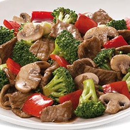 Carne fatiada, brócolis e pimentão, temperado ao molho shoyu.