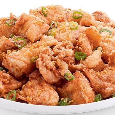 Coxa e sobrecoxa de frango desossado frito, salpicado com alho e cebolinha.