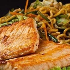 Macarrão, salmão grelhado e legumes desfiados ao molho shoyu.