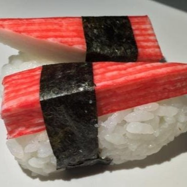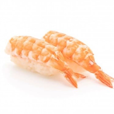 2 unidades de bolinho de arroz com um camarão cozido por cima.