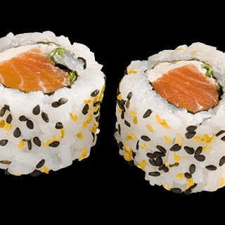 8 unidades de sushi invertido, nori por dentro, gergelim torrado salpicados no gohan, salmão crú com cebolinha e cream cheese.