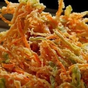 Cenoura, cebola, vagem, pimentão, desfiados, empanado e frito.