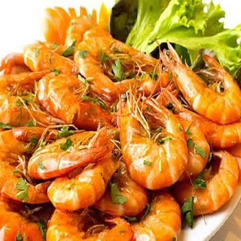 Camarão frito com casca, salpicado com alho, cebola e pimentão.
