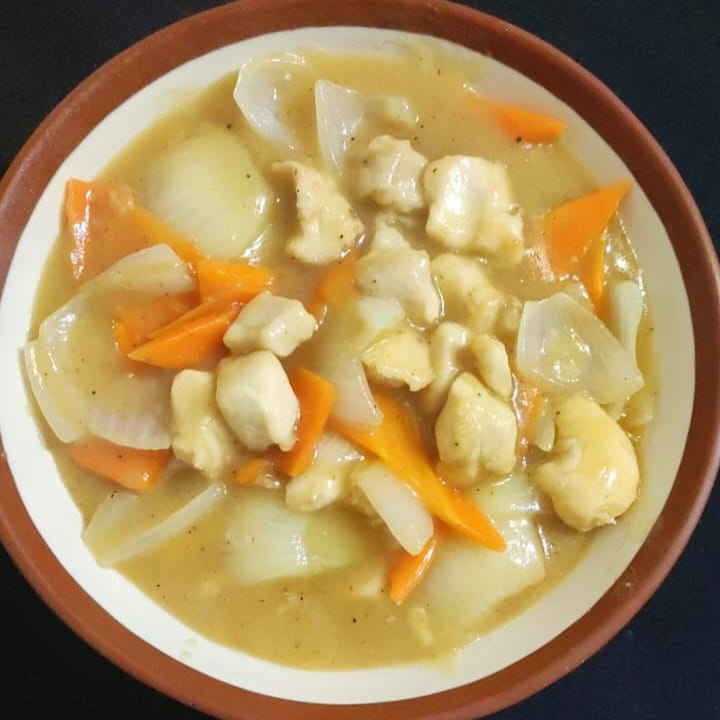 Cubo de peito de frango, cebola, cenoura, temperados ao molho curry.