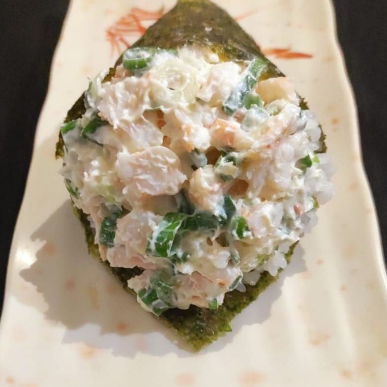 Gohan, nori, camarão, cebolinha e cream cheese.