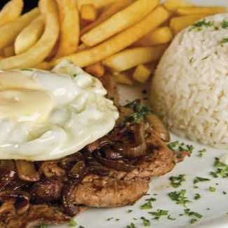 Este Marmitex é preparada com bife grelhado acebolado acompanhada por arroz, feijão, farofa e fritas. Obs.: Todos os complementos deste marmitex são enviados em uma única embalagem (marmitex redonda de 500g.) e não separadamente.