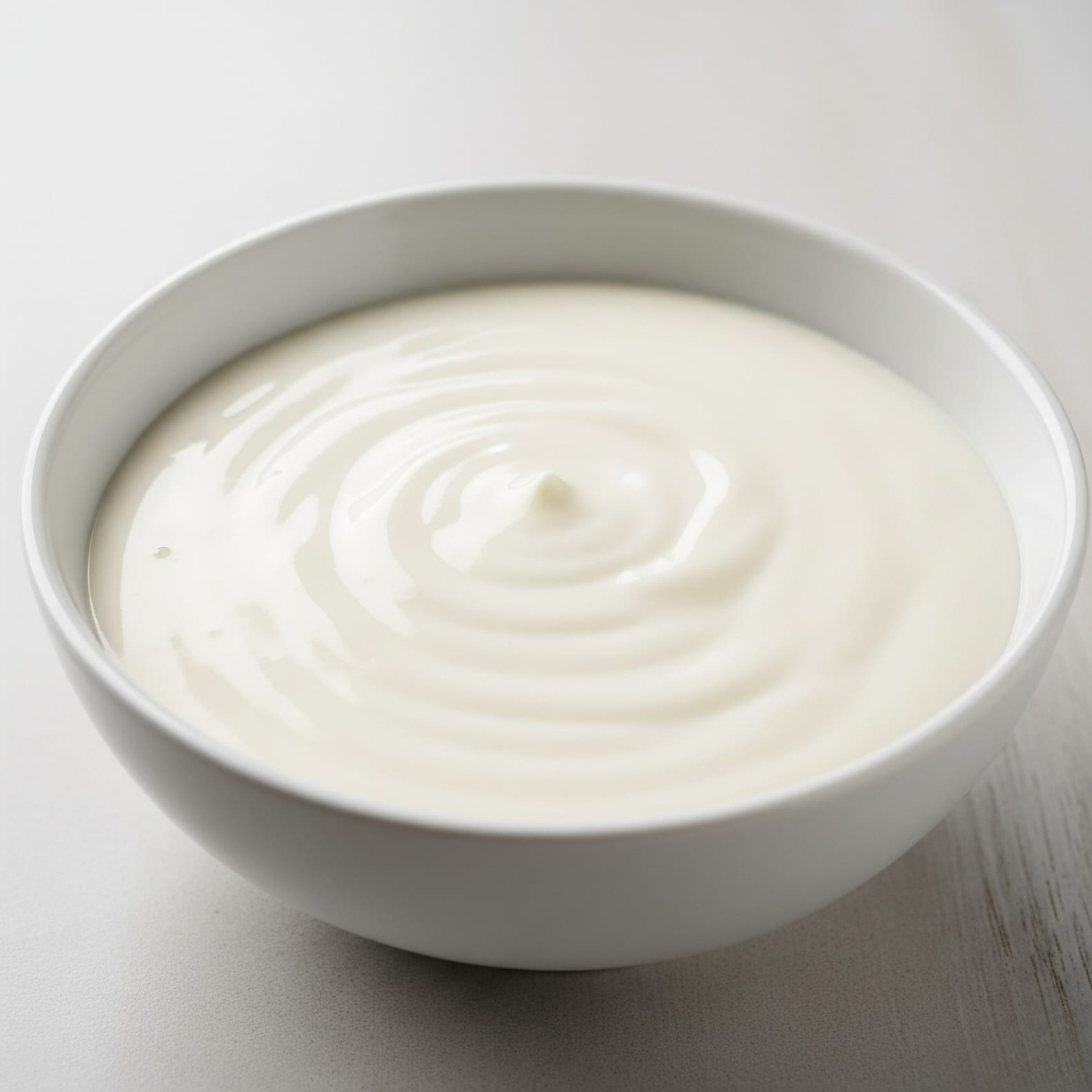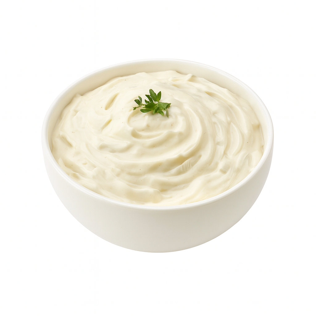 Molho cremoso à base de iogurte e cream cheese, acompanha cebola fresca e fatiada.