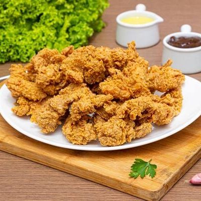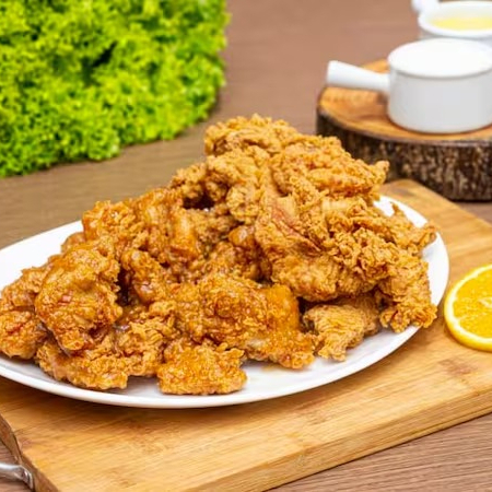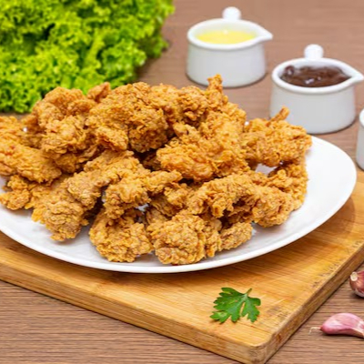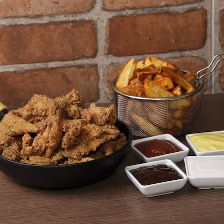 Aprox. 460g de frango crocante no nosso molho Creamy Onion (Cream cheese e cebola,limão e Mel) + batata rústica e acompanha 2 molhos da casa a sua escolha. . Serve 1 a 2 pessoas.