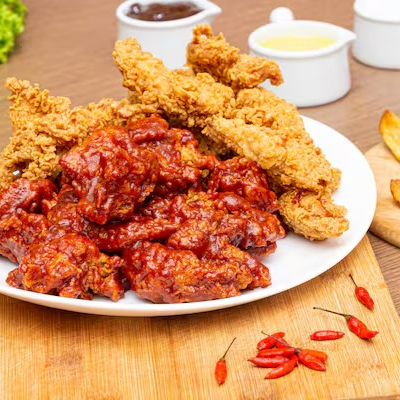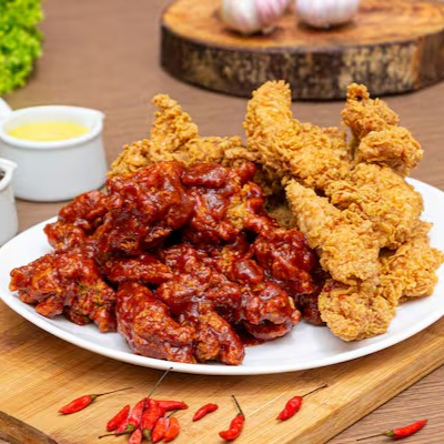 Metade Crok Chicken Original e Metade Apimentado. Sem osso. Acompanha 3 molhos da casa (Sem Batata). Serve 3 a 4 pessoas.