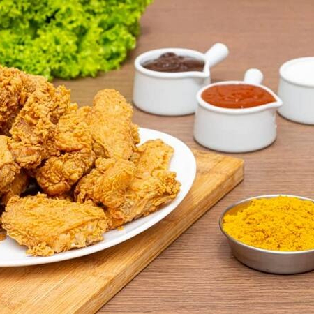 Saboroso frango crocante sem osso, sabor curry + meia batata rústica + 3 molhos especiais da casa a escolha(Alho, Barbecue,Mostarda com mel, pimenta levemente doce).serve 3 a 4 pessoas.