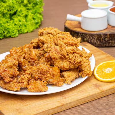 Frango da casa, apimentado sem osso, crocante por fora e suculento por dentro. Acompanha 2 molhos. Serve 1 a 2 pessoas.