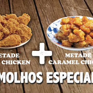 Novo Sabor! Chicken Metade Original + Metade Orange Caramel (Laranja Agridoce). Acompanha 3 molhos da casa (Sem Batata). Serve 3 a 4 pessoas.