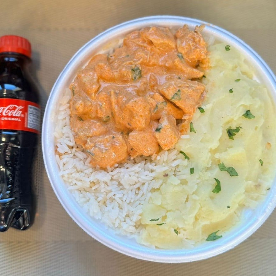 Marmita com delicioso filé de frango ao molho estrogonofe acompanhado de arroz branco e purê de batatas inglesas. Acompanha refrigerante pet Coca Cola bem gelado. Marmita indicada para 01 pessoa.