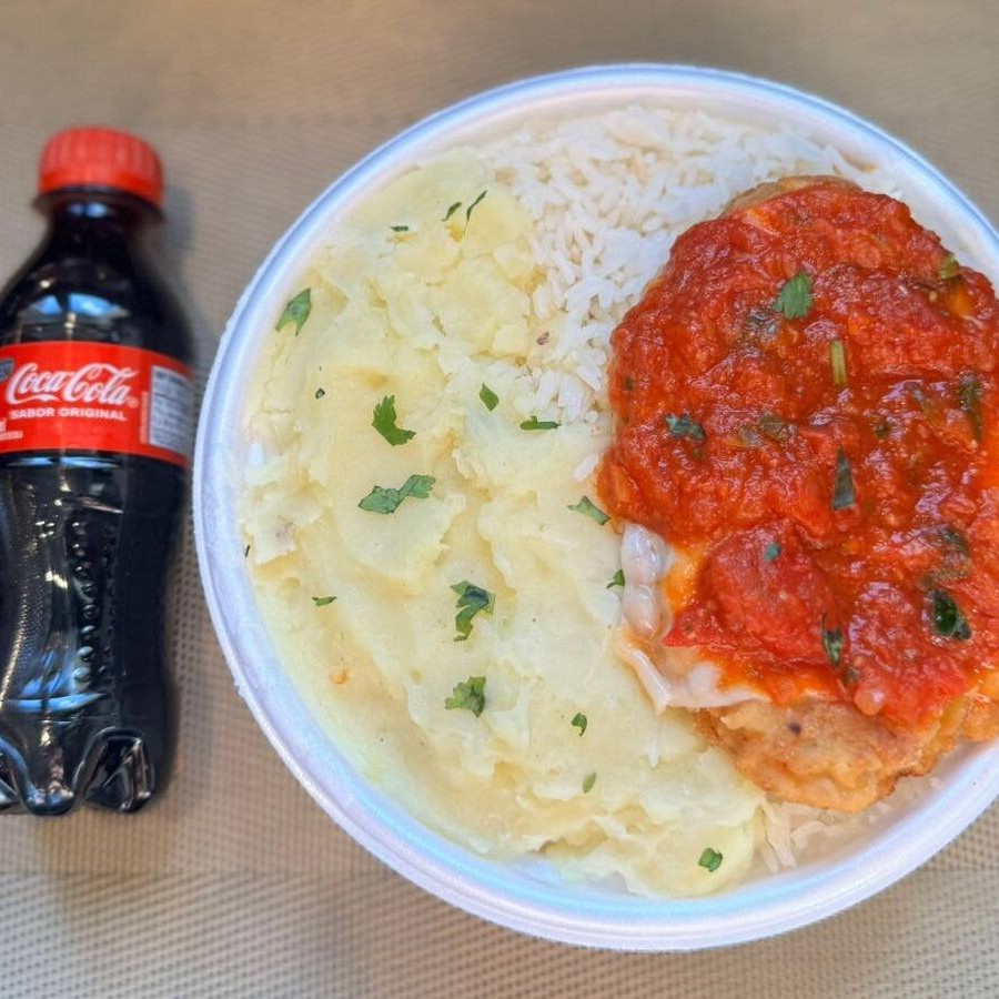 Marmita com delicioso filé de frango parmegiana (empanado na massa crocante coberto com molho de tomates e queijo) acompanhado de arroz branco e purê de batatas inglesas. Acompanha refrigerante pet Coca Cola bem gelado. Marmita indicada para 01 pessoa.