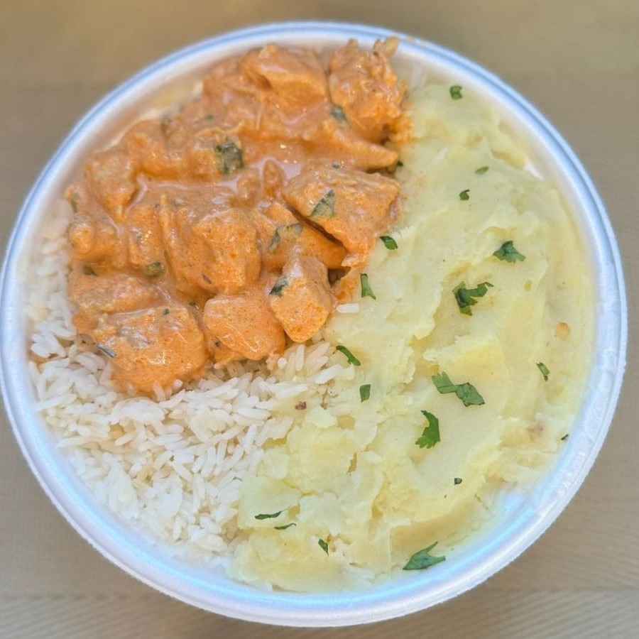 Marmita com delicioso filé de frango ao molho estrogonofe acompanhado de arroz branco e purê de batatas inglesas. Marmita indicada para 01 pessoa.