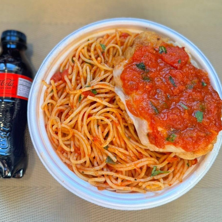 Marmita com delicioso filé de frango parmegiana (empanado na massa crocante coberto com molho de tomates e queijo) acompanhado de macarrão espaguete ao molho de tomates. Acompanha refrigerante pet Coca Cola Zero sem açúcar bem gelado. Marmita indicada para 01 pessoa.