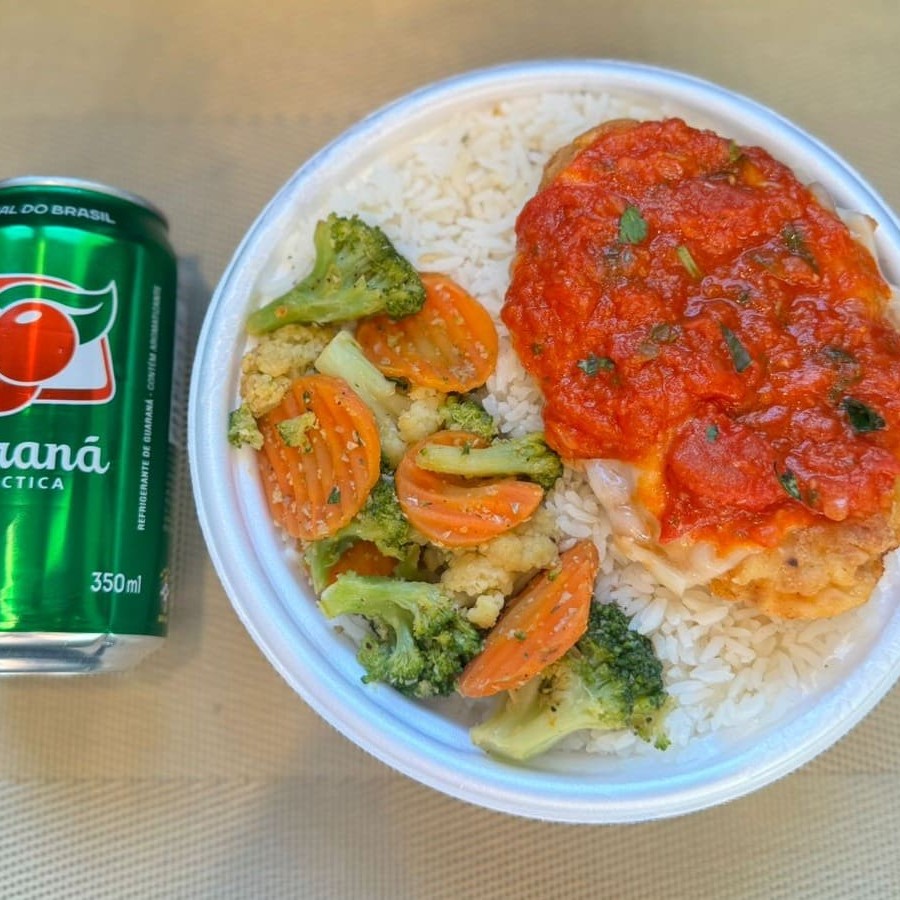Marmita com delicioso filé de frango parmegiana (empanado na massa crocante coberto com molho de tomates e queijo) acompanhado de arroz branco e mix de legumes. Acompanha refrigerante lata Guaraná Antárctica lata 350ml bem gelada. Marmita indicada para 01 pessoa.