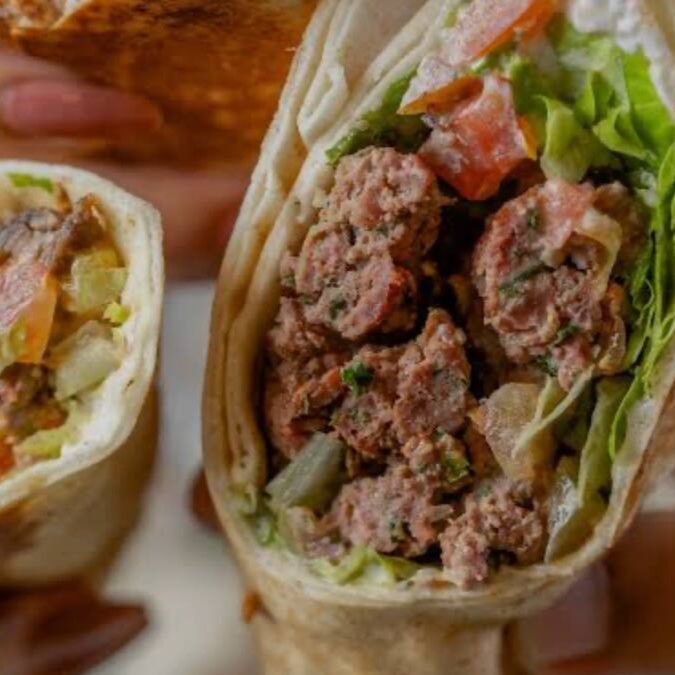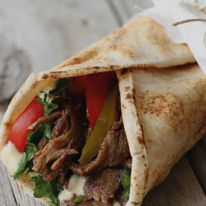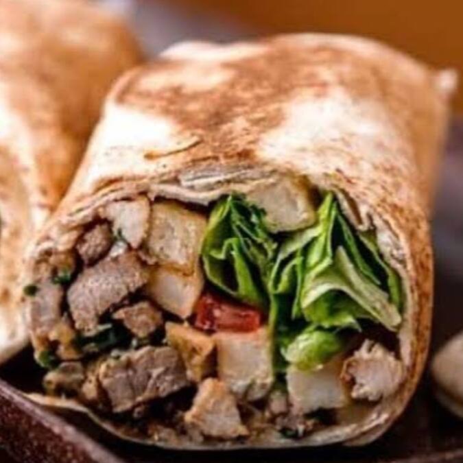Carne bovina - Maionese verde - Alface -tomate - Picles - Batata frita - enrolado no pão sírio