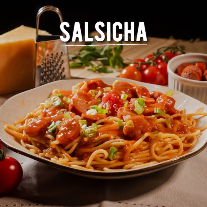 Massa Espaguete grano duro, com molho Sugo encorpado com Salsicha de primeira qualidade preparado com o jeitinho do Chefinhos. Pode acreditar cabe muito na embalagem!