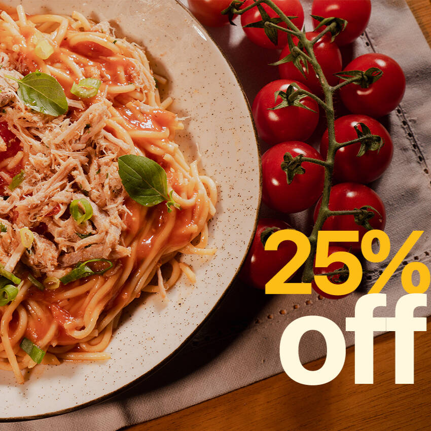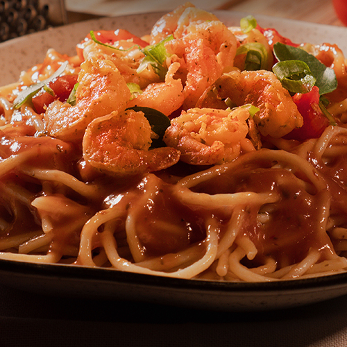 250g de espaguete envolvido em 250g de Molho Artesanal Italiano de Tomate Pelado e 75g de camarões de verdade salteados na manteiga e alho.