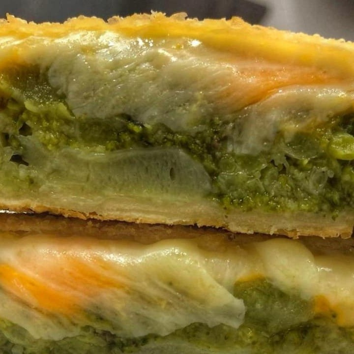Pastel de brócolis com três queijos (muçarela, requeijão e cheddar)