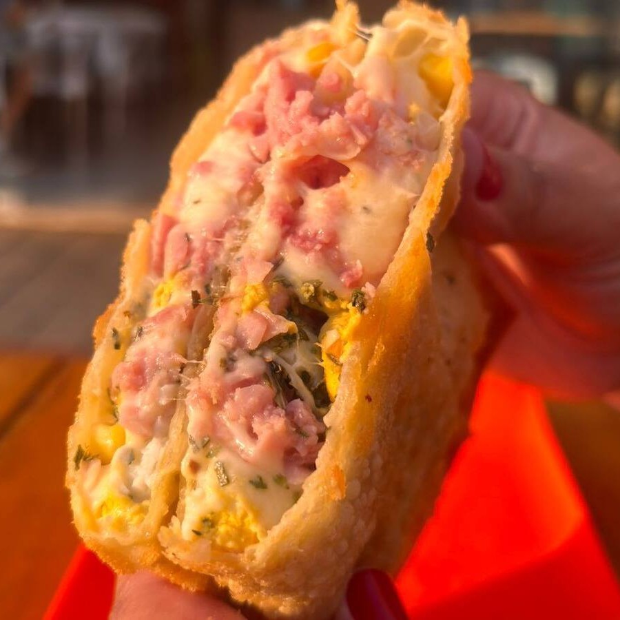 O clássico no mundo das pizzas, aqui vai dentro do Pastel: Muçarela, presunto ralado, ovo cozido, cebola em cubos, milho e orégano.