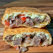 Contra filé grelhado, queijo derretido, vinagrete e creme de alho da casa na massa leve e crocante. Pastel completo, suculento e feito na hora.