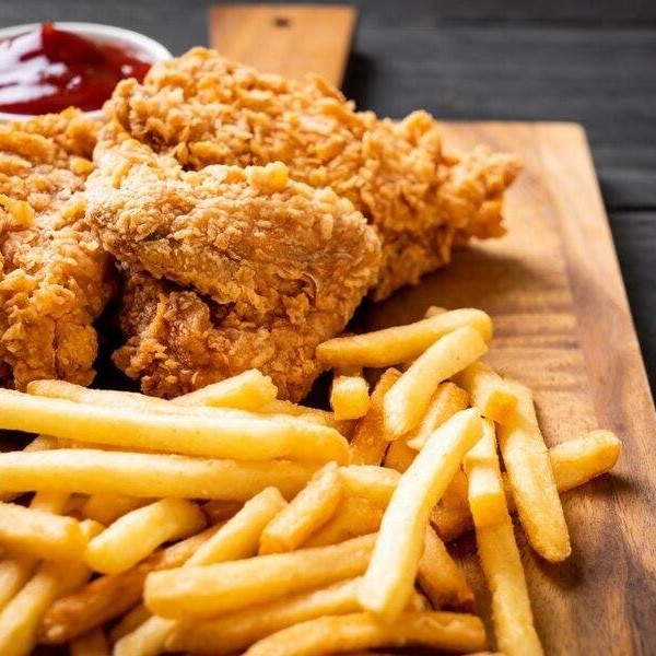 Frango frito desossado crocante +2 acompanhamentos + 2 molhos à sua escolha.+coca cola 1,5l