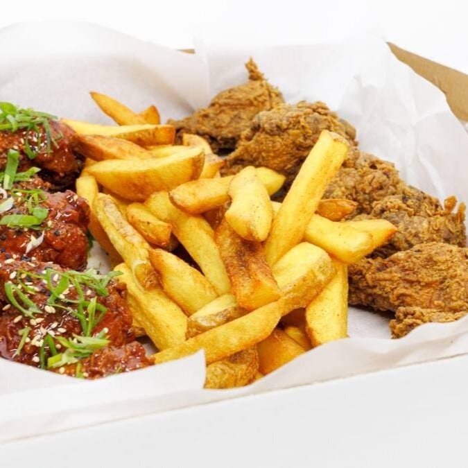 Metade frango frito crocante e metade frango frito apimentado Korean Style + 1 acompanhamento e 1 molho à sua escolha + coca cola 350ml