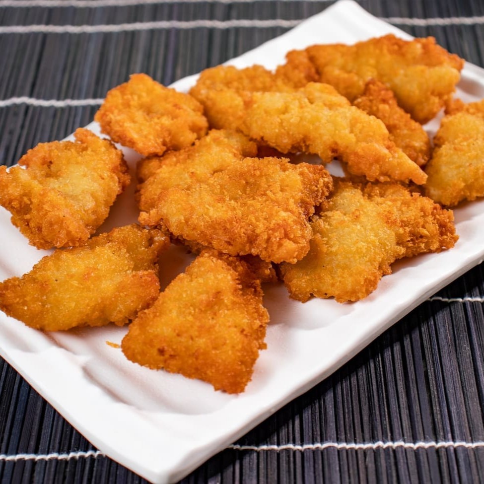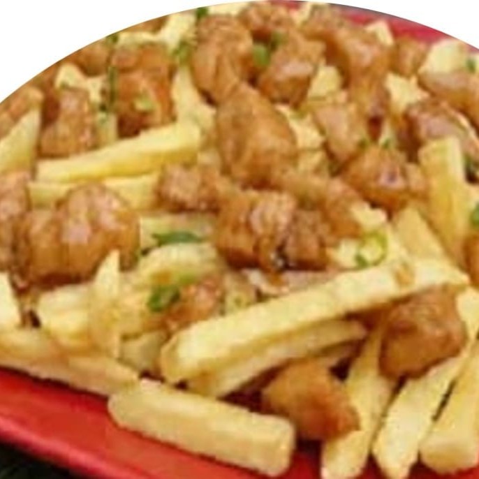 Pedaços de frango desossados fritos e salpicados com alho e cebola.