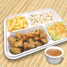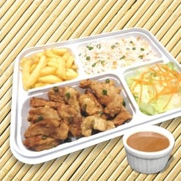 Frango á passarinho, yakimeshi, batata frita e salada (Obs: Sem alteração dos itens ou troca)