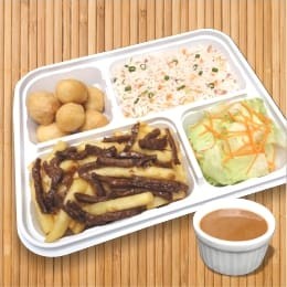 Carne com batata, yakimeshi, frango empanado e salada (Obs: Sem alteração dos itens ou troca)