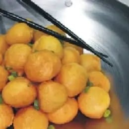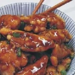 Pedaços de frango desossados fritos cobertos com molho oriental a base de gengibre.
