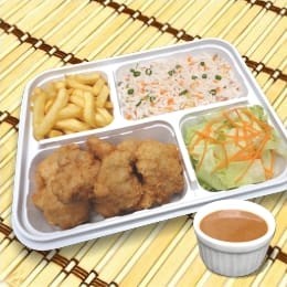 Frango empanado, yakimeshi, batata frita e salada (Obs: Sem alteração dos itens ou troca)