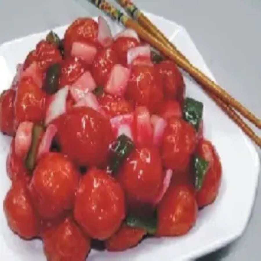 Cubos de peito de frango empanados, cebola, pimentão e abacaxi ao molho agridoce.