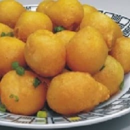Pedaços de banana ou abacaxi empanados e caramelados, salpicados c/ semente de gergelim. escolha até duas frutas.