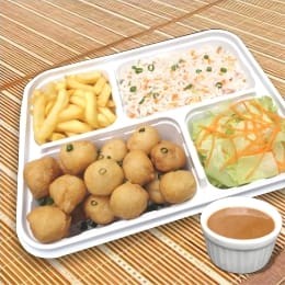 Frango crispy, yakimeshi, batata frita e salada (Obs: Sem alteração dos itens ou troca)