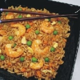 Risoto c/ camarões selecionados, cenoura, ervilhas frescas e ovo em flocos, temperados c/ cebola picada e molho de soja.