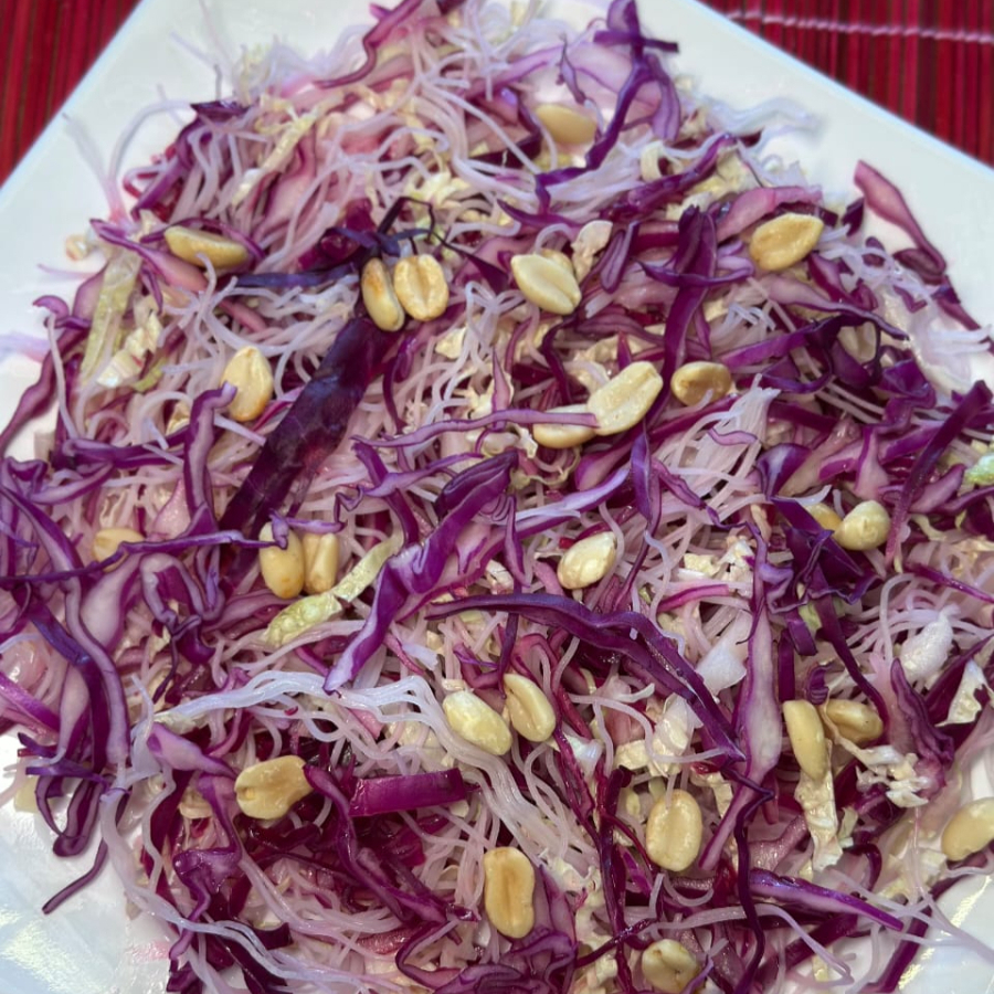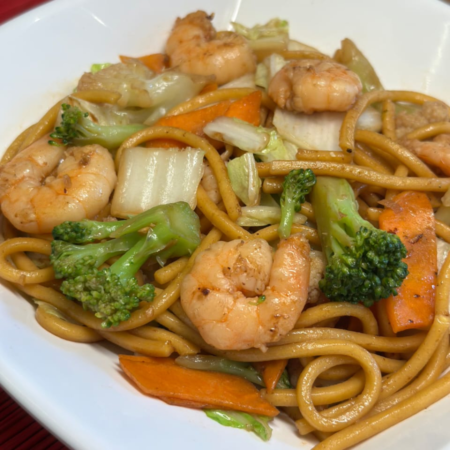 Macarrão chinês c/ camarões selecionados, acelga, brócolis, couve-flor e cenoura.