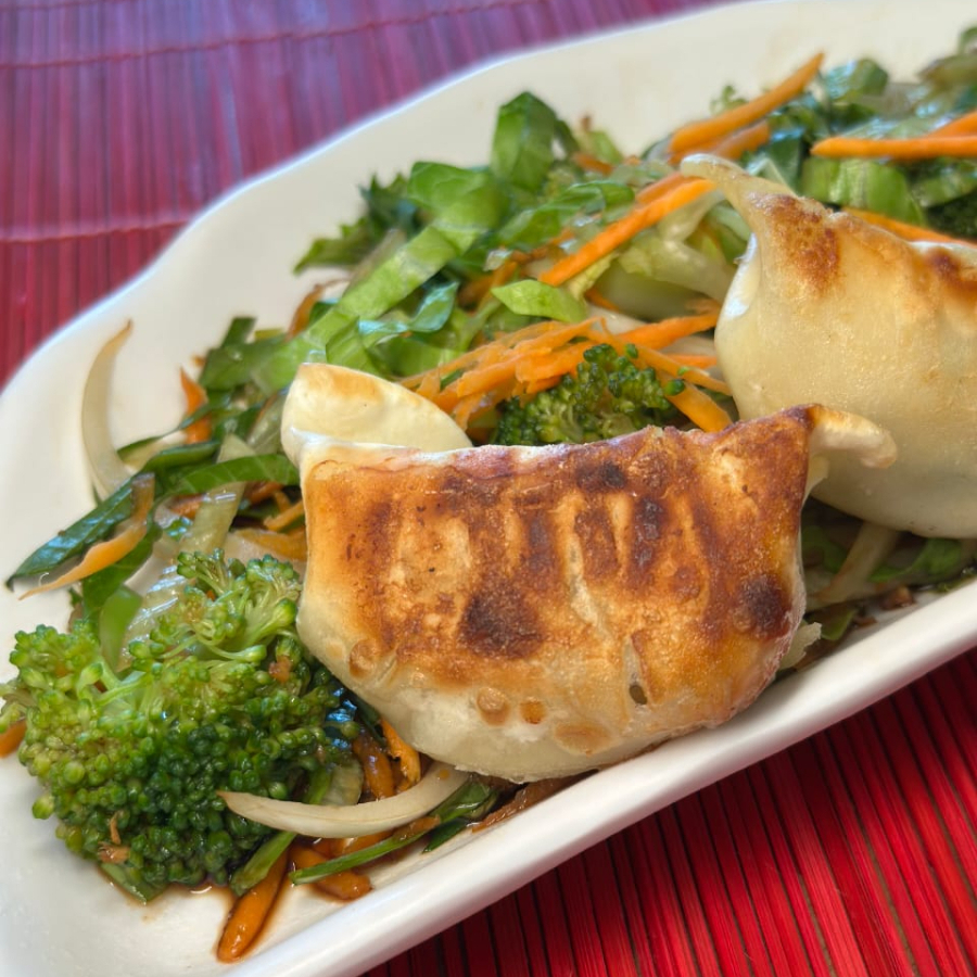 Massa leve recheada com lombo ou frango temperado. Acompanha molho de soja temperado com gengibre.