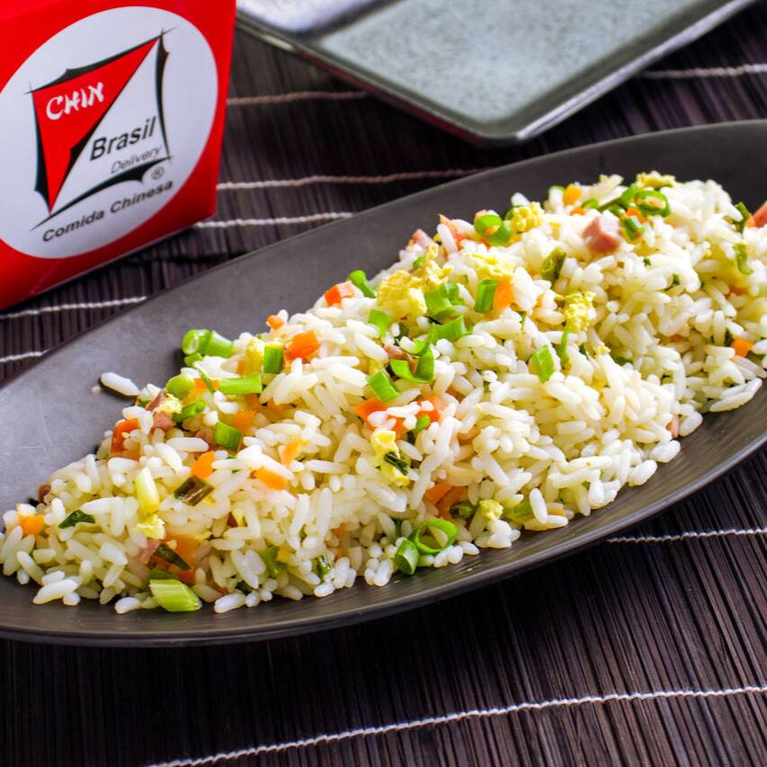 Risoto c/ pedaços de frango, cenoura, ervilhas frescas e ovo, temperados com cebola picada e molho de soja.