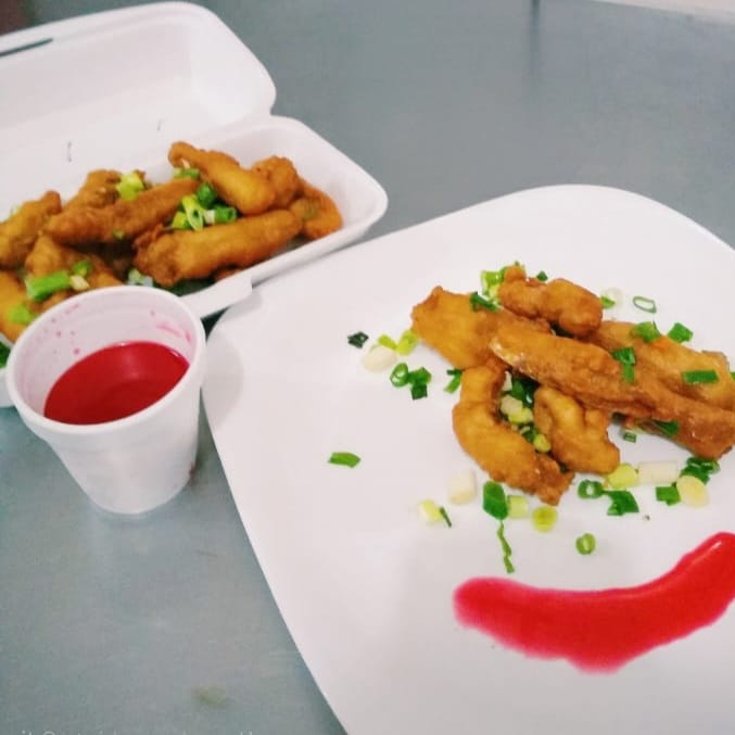 Coxa e sobre coxas de frango desossada empanada e frita ao molho de gengibre levemente picante.