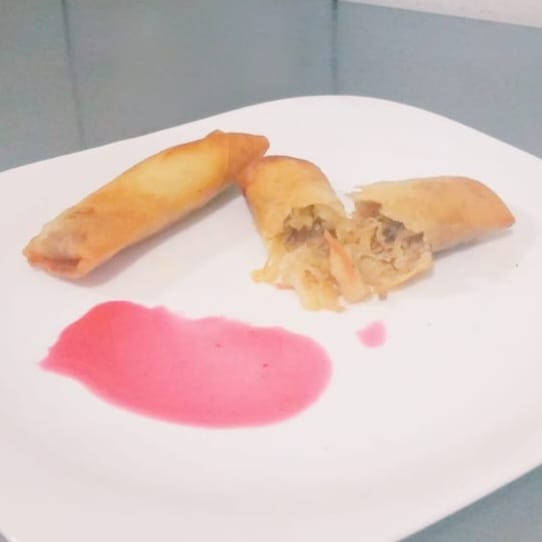 Massa fina crocante recheada com carne ,repolho e cenoura .[acompanha molho agridoce]