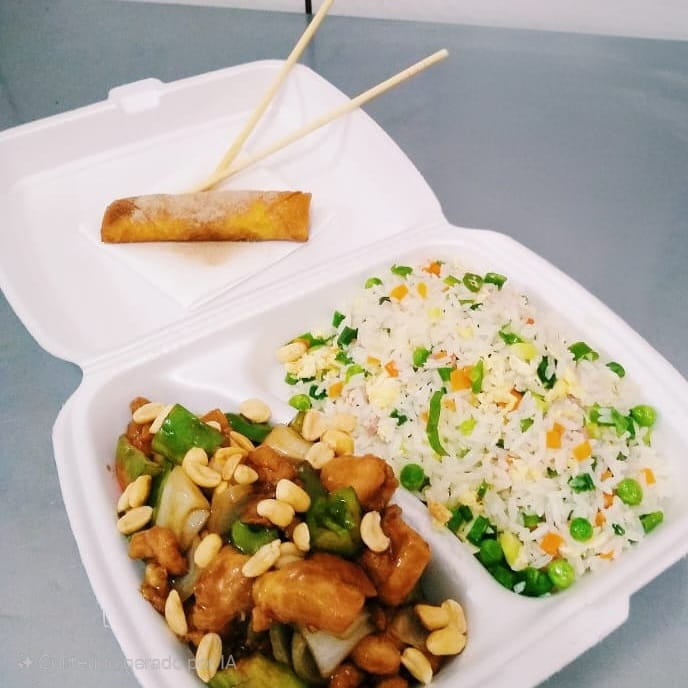 Yakimeshi + um acompanhamento a base de carne , frango ou lombo + uma sobremesa [rolinho romeu e julieta ou rolinho de banana com chocolate]